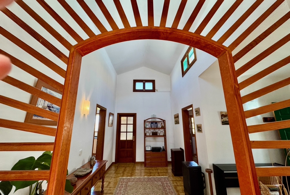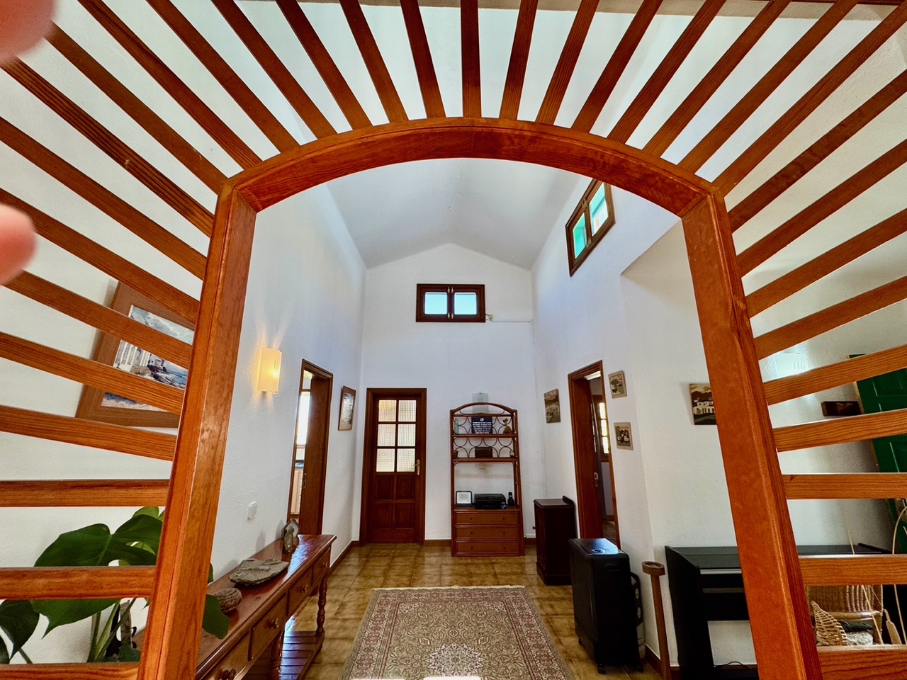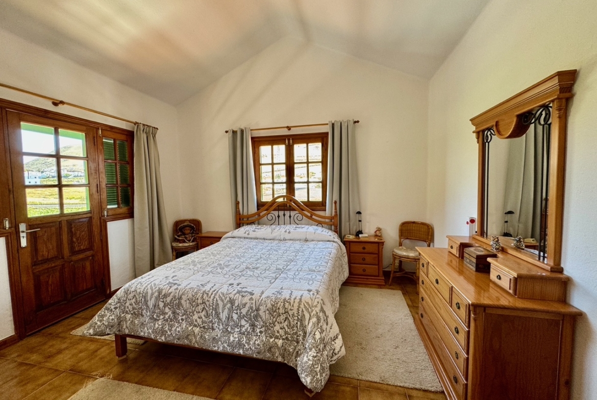 The main house has a constructed area of 210 square meters. The semi-basement has an area of approximately 36 square meters and is used as a very spacious garage (with space for 2 or 3 cars). The ground floor is distributed into 3 bedrooms, two bathrooms, a spacious double height atrium space, a kitchen-dining room, a living room with a log burning stove and a cosy second sitting room with doors opening onto a side terrace with magnificent views. An exterior staircase leads to an upstairs room of 8 square meters with a WC and handbasin. This room currently is used as a small gym but could be used as a fourth bedroom. A door leads out onto a massive roof terrace with panoramic country and mountain views. There is a Canarian style seated area for outside entertaining or watching the beautiful evening sunsets.