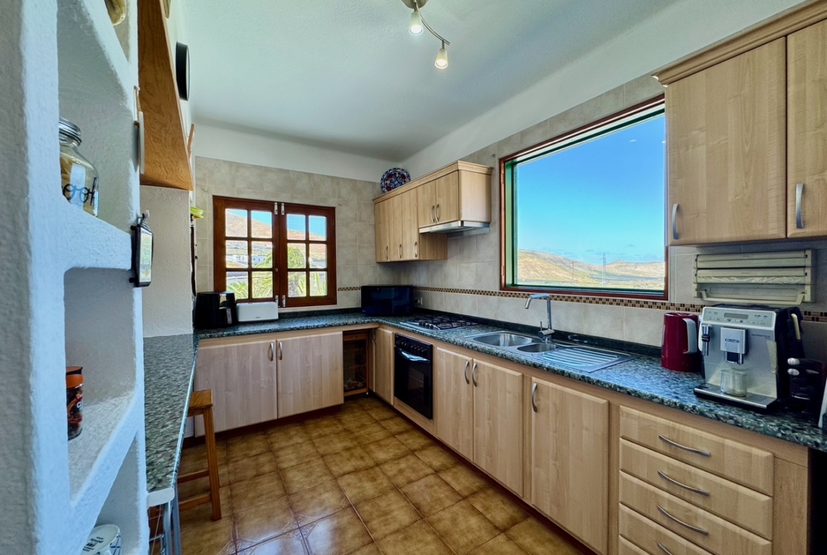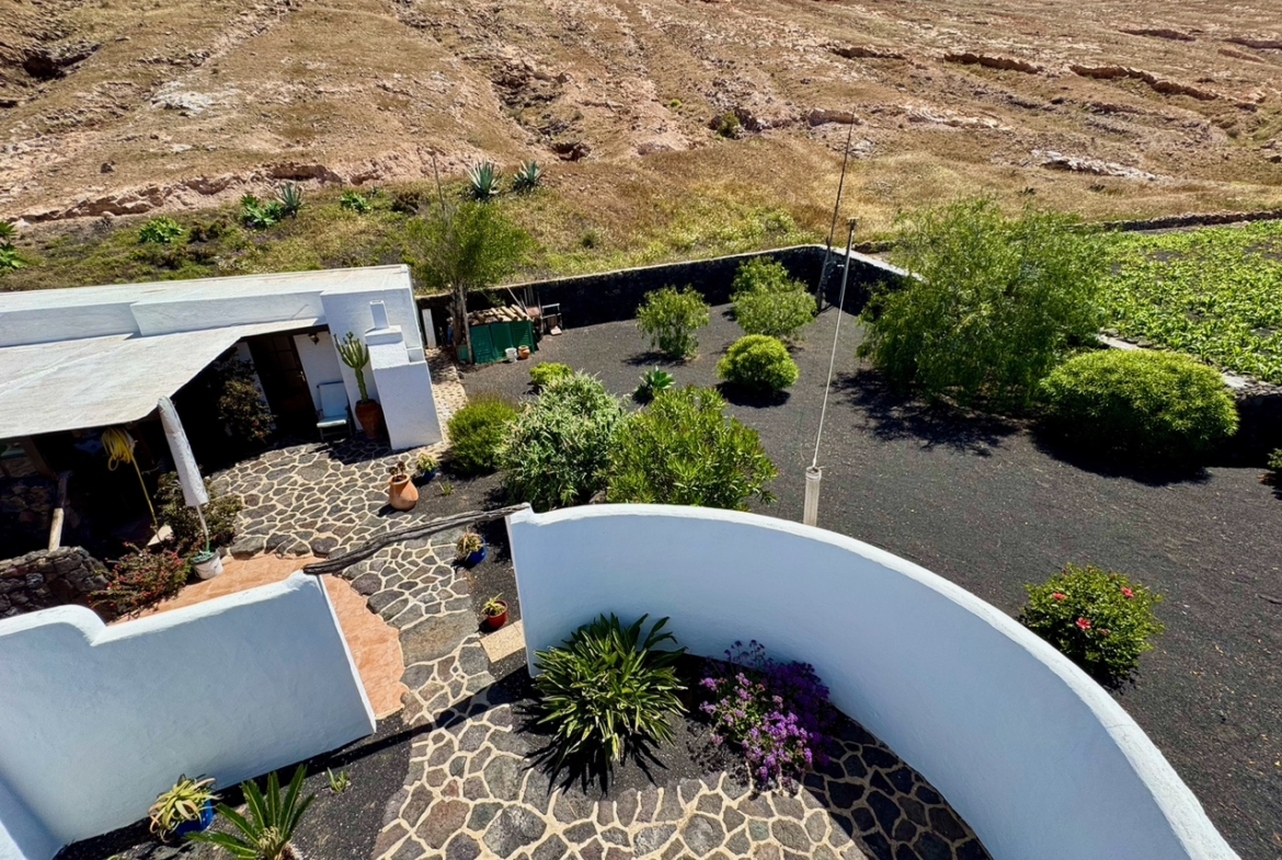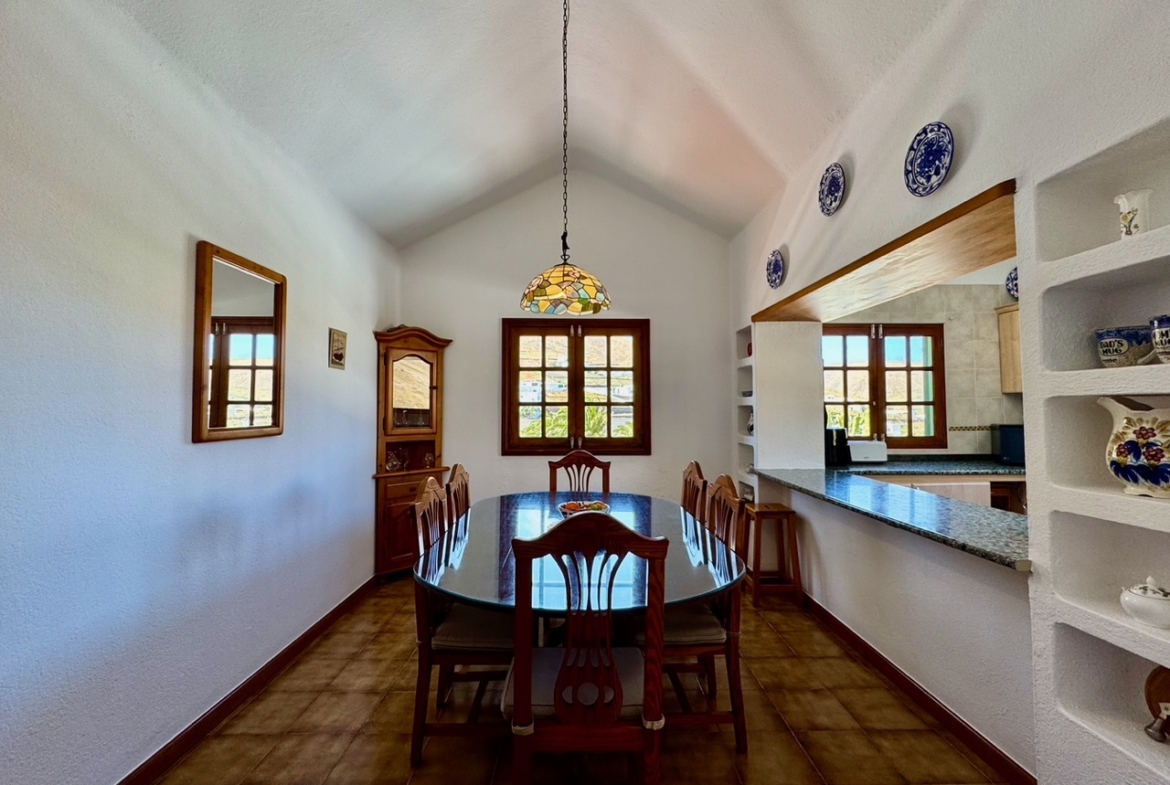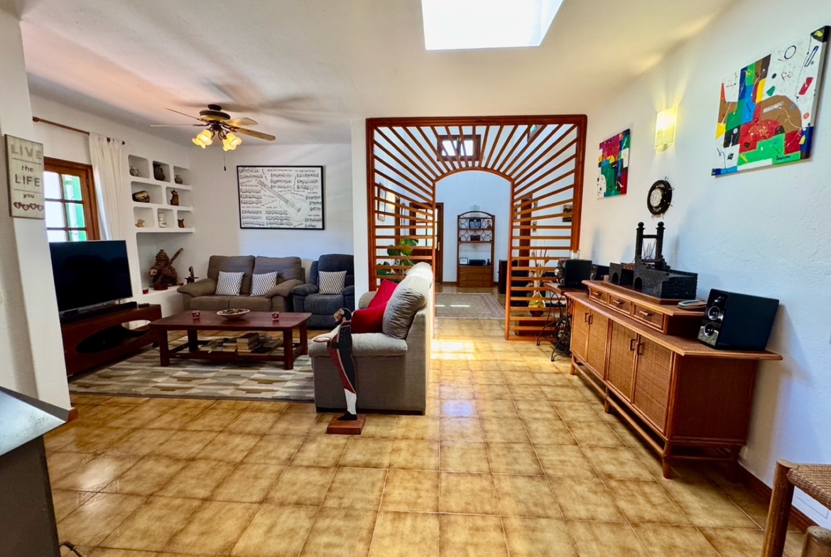 The main house has a constructed area of 210 square meters. The semi-basement has an area of approximately 36 square meters and is used as a very spacious garage (with space for 2 or 3 cars). The ground floor is distributed into 3 bedrooms, two bathrooms, a spacious double height atrium space, a kitchen-dining room, a living room with a log burning stove and a cosy second sitting room with doors opening onto a side terrace with magnificent views. An exterior staircase leads to an upstairs room of 8 square meters with a WC and handbasin. This room currently is used as a small gym but could be used as a fourth bedroom. A door leads out onto a massive roof terrace with panoramic country and mountain views. There is a Canarian style seated area for outside entertaining or watching the beautiful evening sunsets.