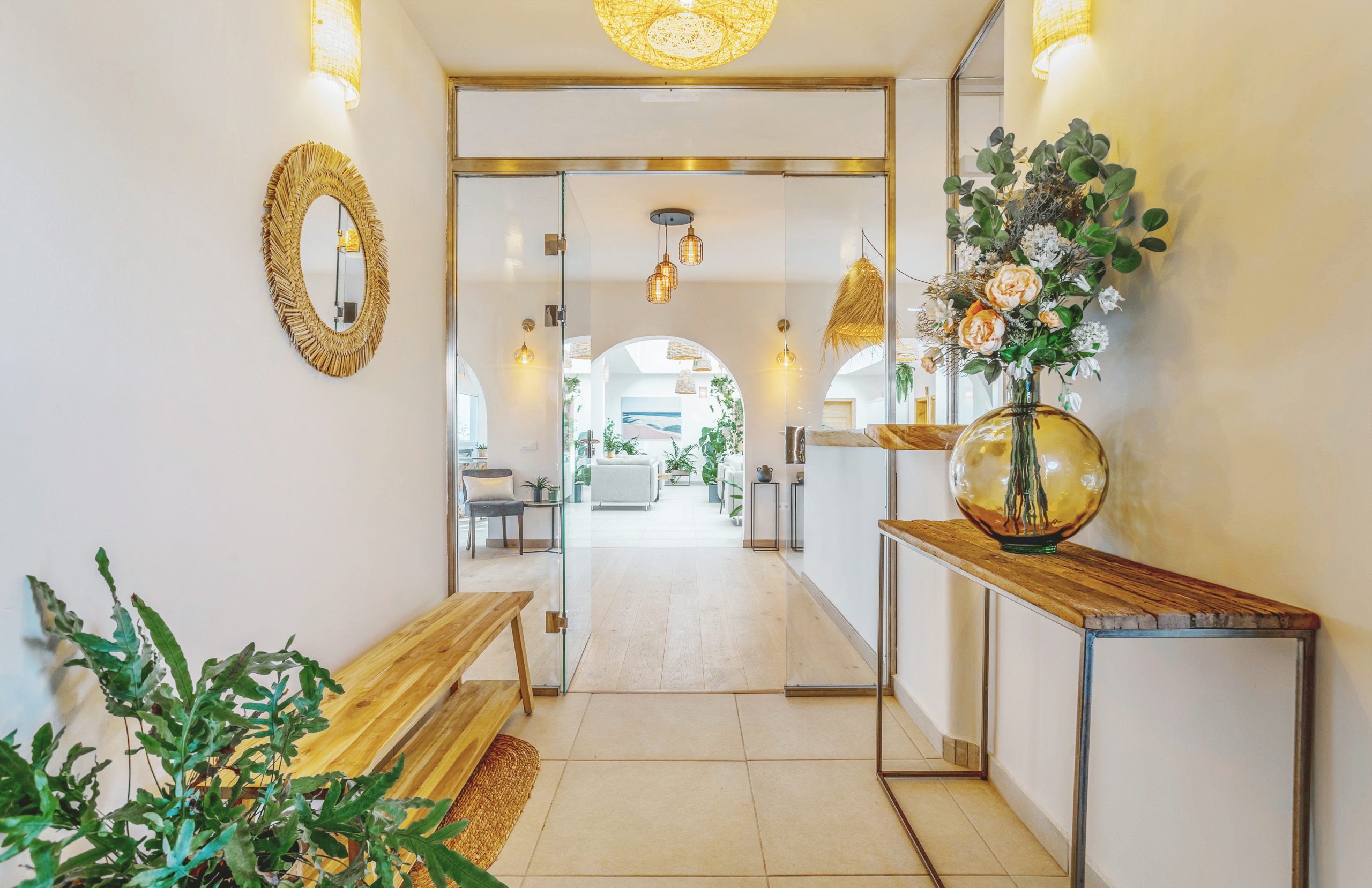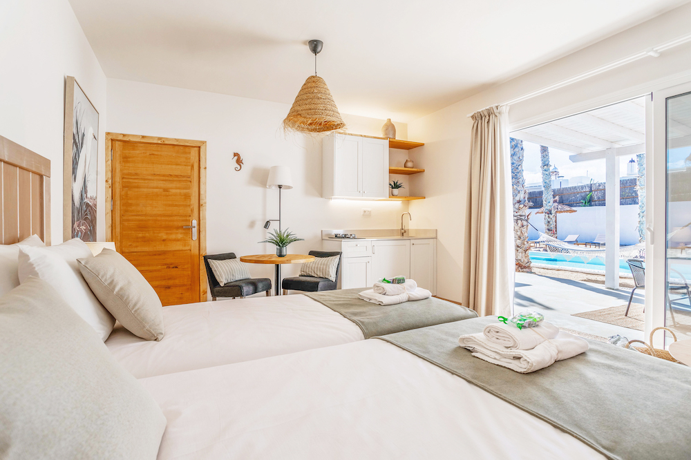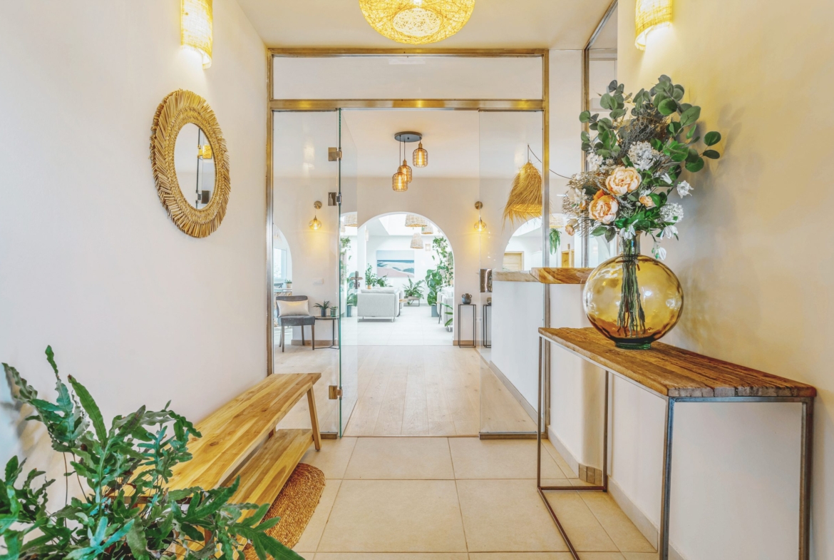The outdoor areas create a private, resort-style setting with mature gardens and a white-sand relaxation space surrounding the pool. The rooftop terrace provides an ideal space for entertaining, dining, or enjoying Lanzarote’s sunsets.