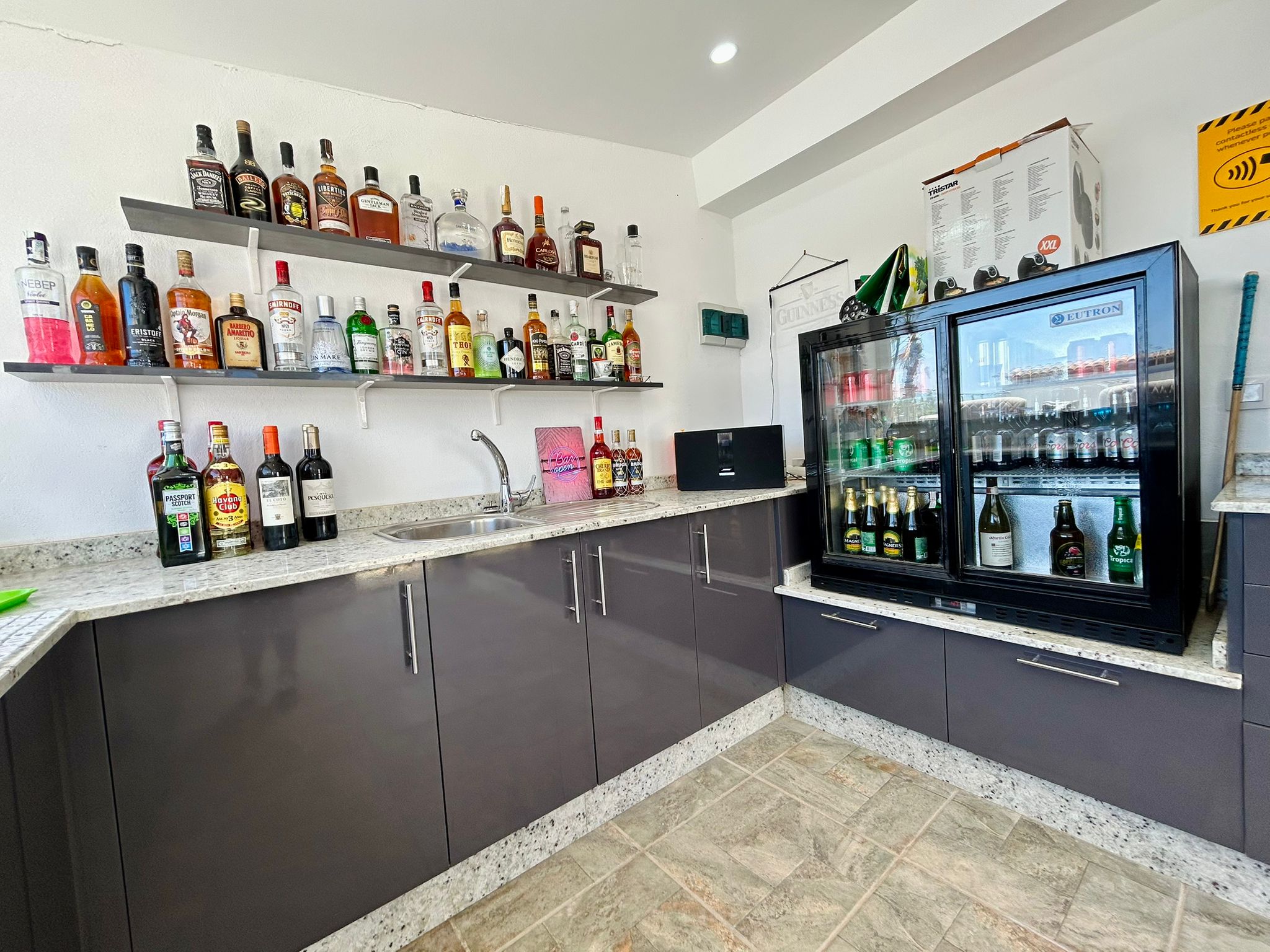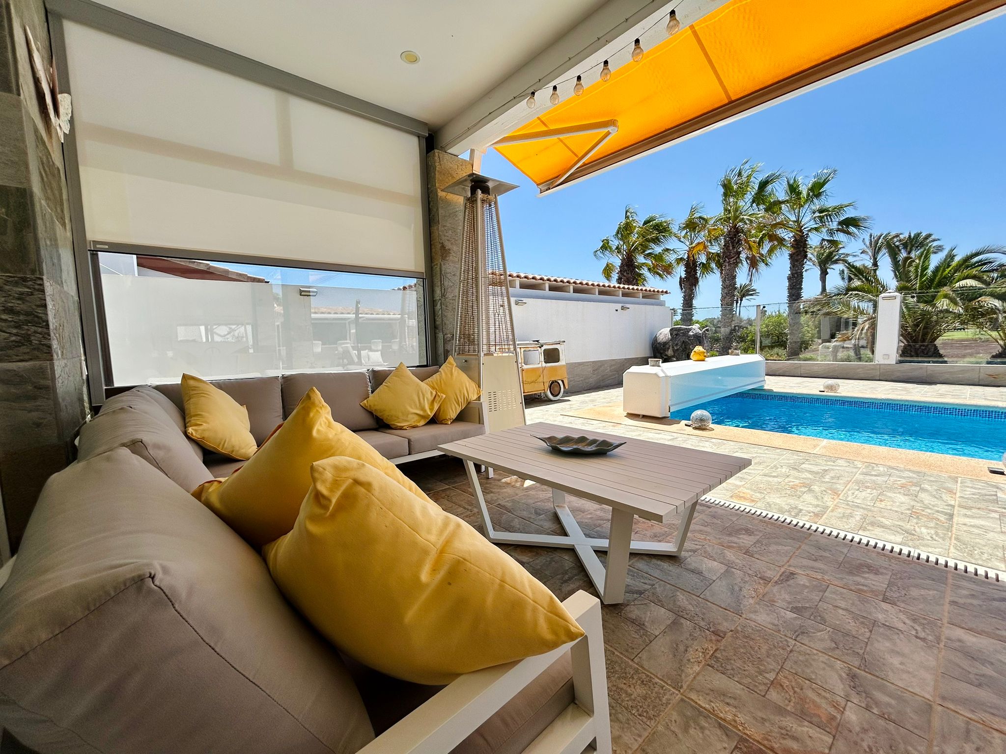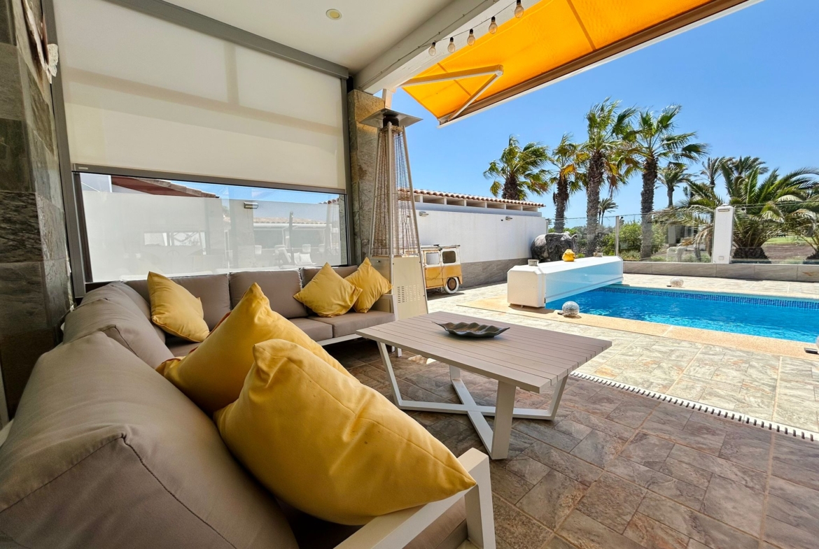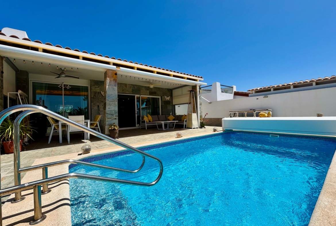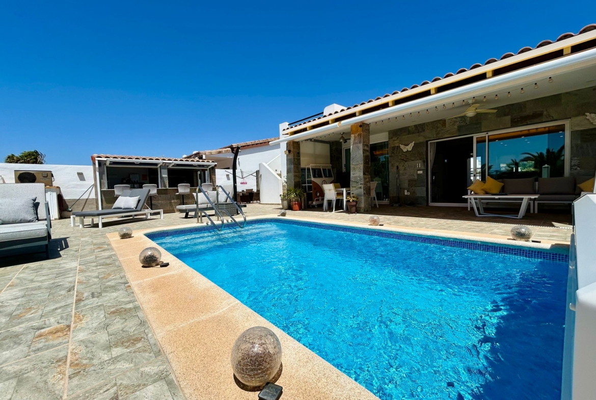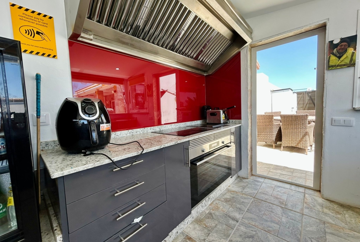 Outside, the villa truly shines with a private swimming pool, a fully equipped outdoor kitchen with bar, and ample space for relaxing or entertaining in the year-round sunshine.