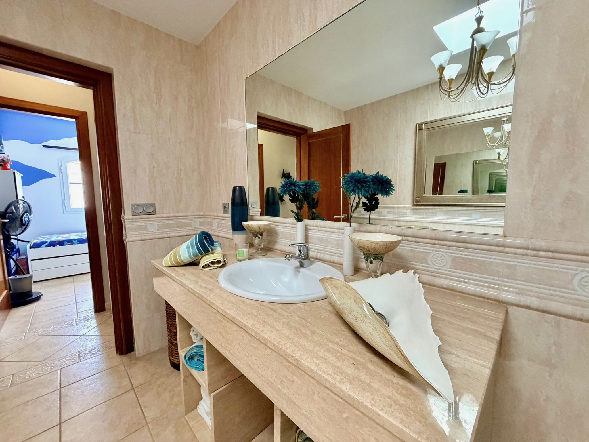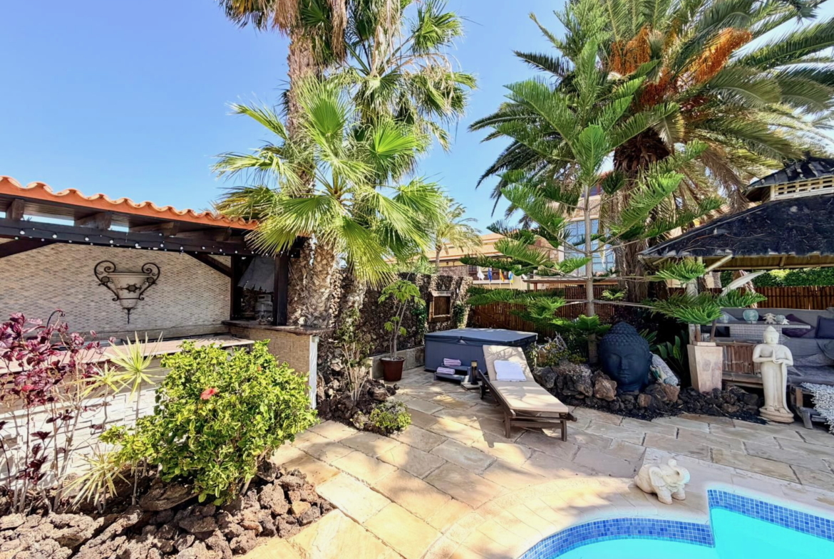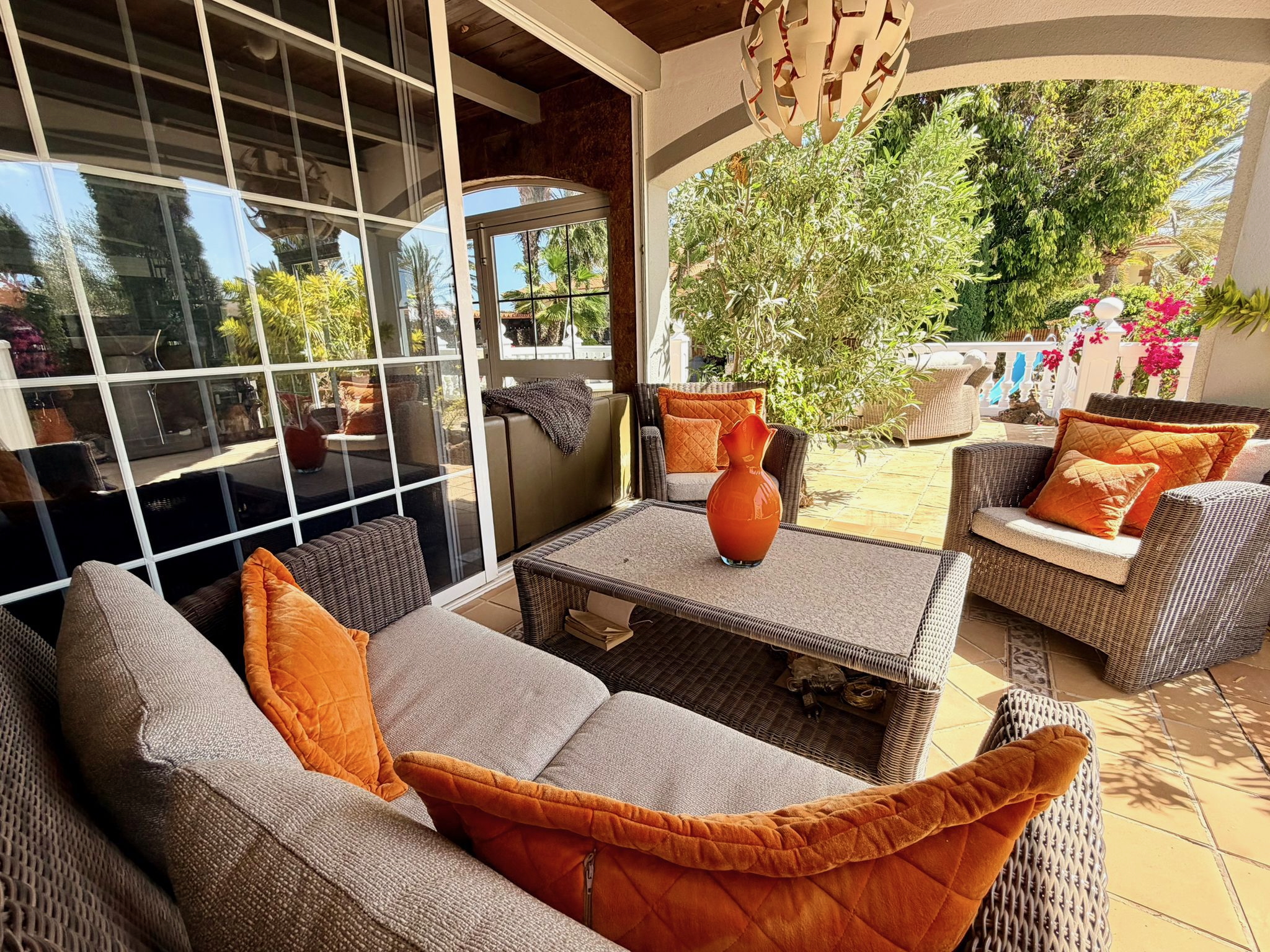 Externally, the villa is set within mature landscaped gardens with palm trees and water features. The rear garden is arranged over two levels, with a flagstone terrace leading down to a large heated swimming pool.