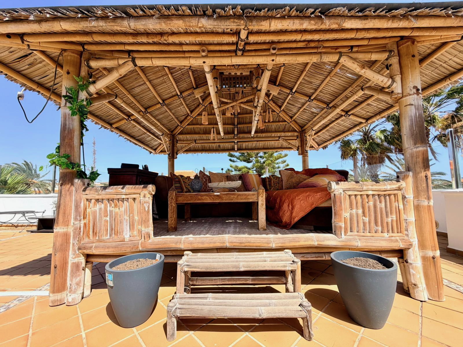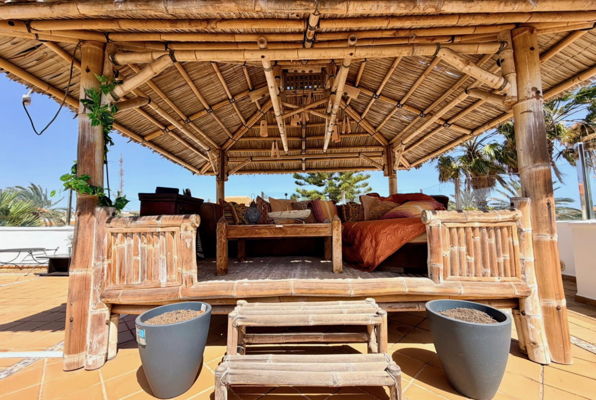 - Two gazebos, including a roof terrace with golf and sea views