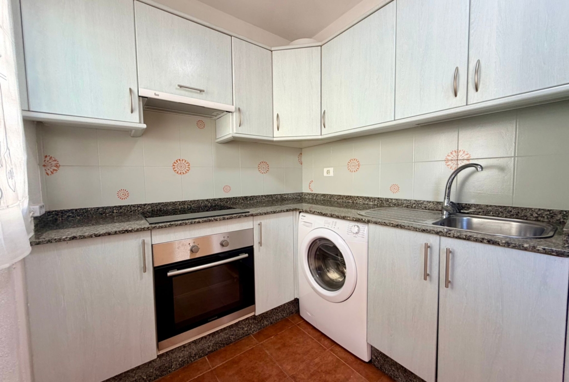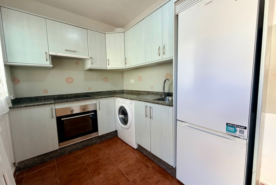 Arranged over two levels, the property features a bright and spacious living–dining area and a separate, fully fitted kitchen with direct access to a private tiled garden—ideal for outdoor dining, relaxing, or entertaining.