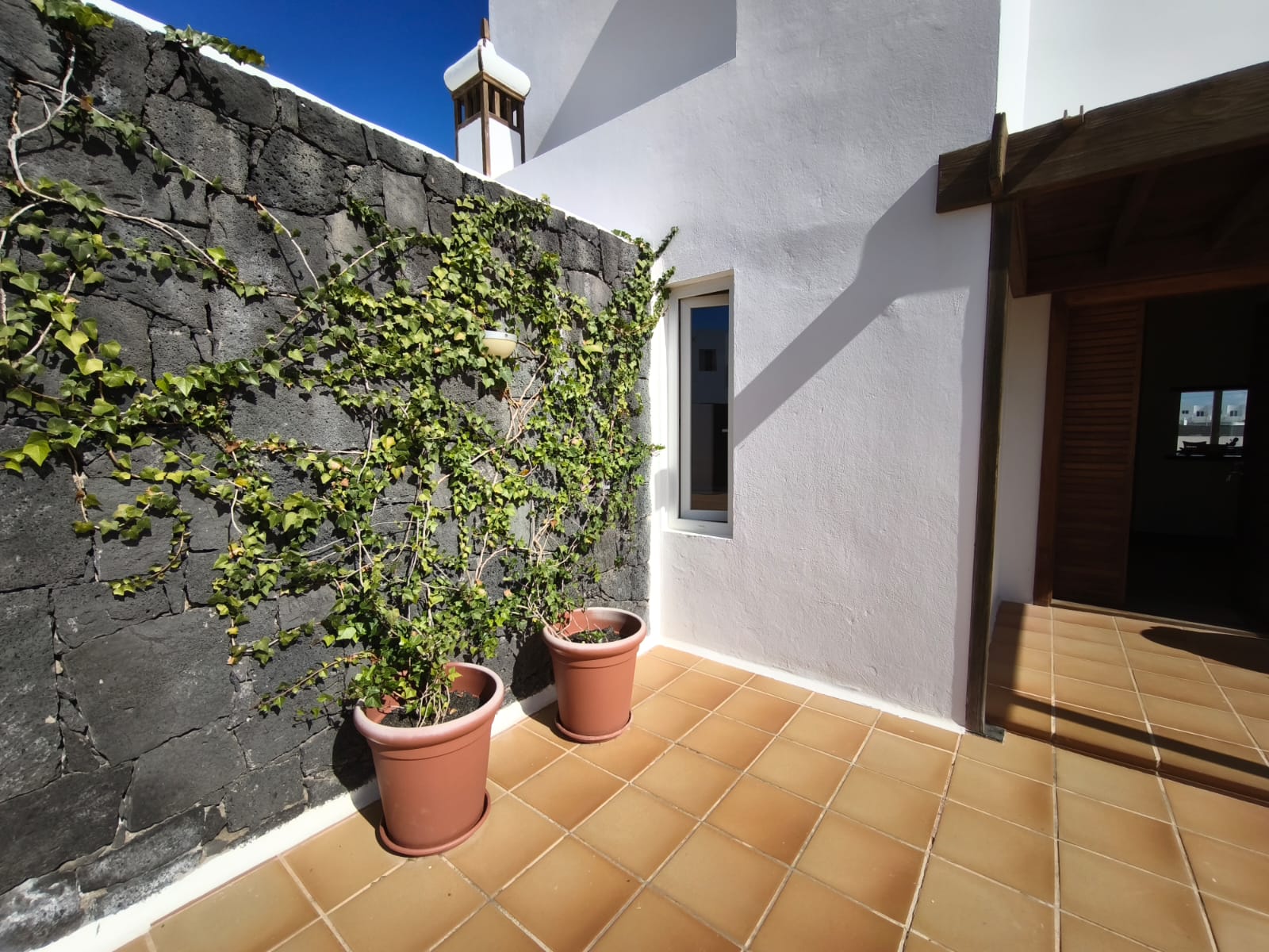 The property is surrounded by polished volcanic stone walls and features a spacious patio and garden with fruit trees, as well as handcrafted wrought-iron gates by a renowned local artist.